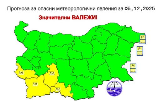 В четири области е обявен жълт код за значителни валежи. Предупреждението за потенциално опасно време е в сила заобластите Кюстендил, Благоевград, Пазарджик и Смолян.