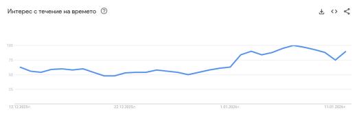 Нека преди това видим картината на интереса към Grok в САЩ – тя е съществено различна от българската. Данните сочат устойчив и висок базов интерес, който не пада до нулеви стойности, а се движи в диапазона 50–90 пункта, с отчетлив ръст в началото на януари. Това е потвърждение, че за разлика от тук, технологията е част от ежедневния публичен и потребителски разговор, а не просто реакция на единична новина.